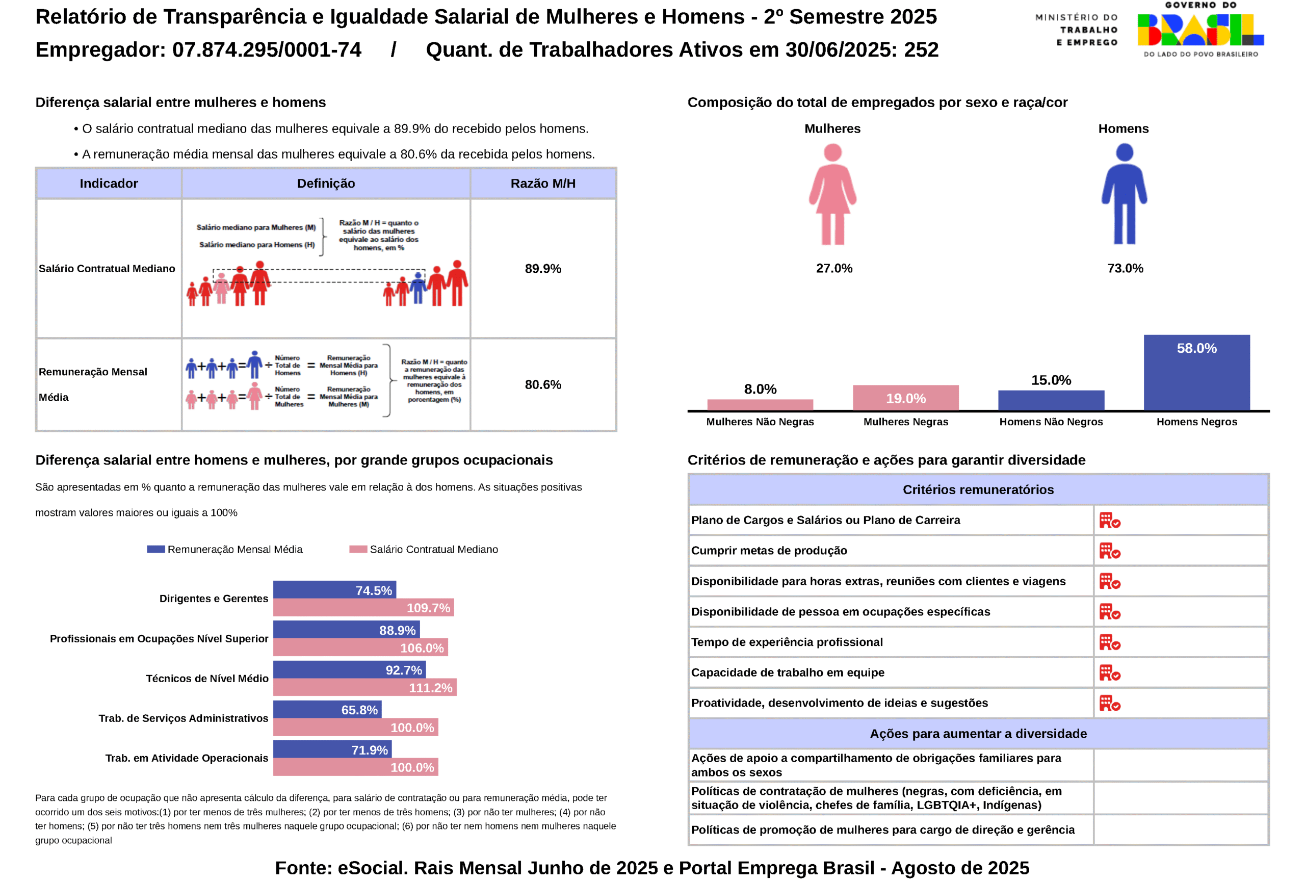 Este é o relatório de transparência salarial, elaborado e disponibilizado pelo Ministério do Trabalho e Emprego, que dispõe sobre a igualdade salarial e de critérios remuneratórios entre homens e mulheres.